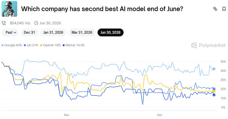 Predictions for June next year also favor Google while nudging xAI into the second place, with OpenAI now third:
