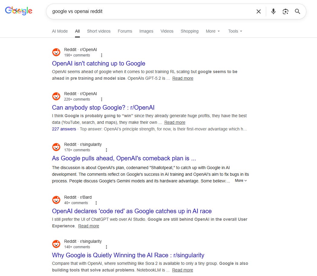 Here’s an unfiltered snapshot of my “Google vs. OpenAI Reddit” search: