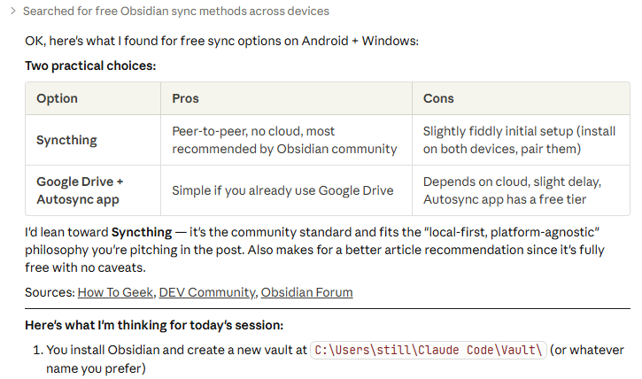 Syncthing is free and Claude Code can walk you through the entire process (it’s pretty straightforward). In my case, I now have a dedicated “Inbox” folder with a file called “Brain Dump.md” where I can throw any thought and notes while away from home: