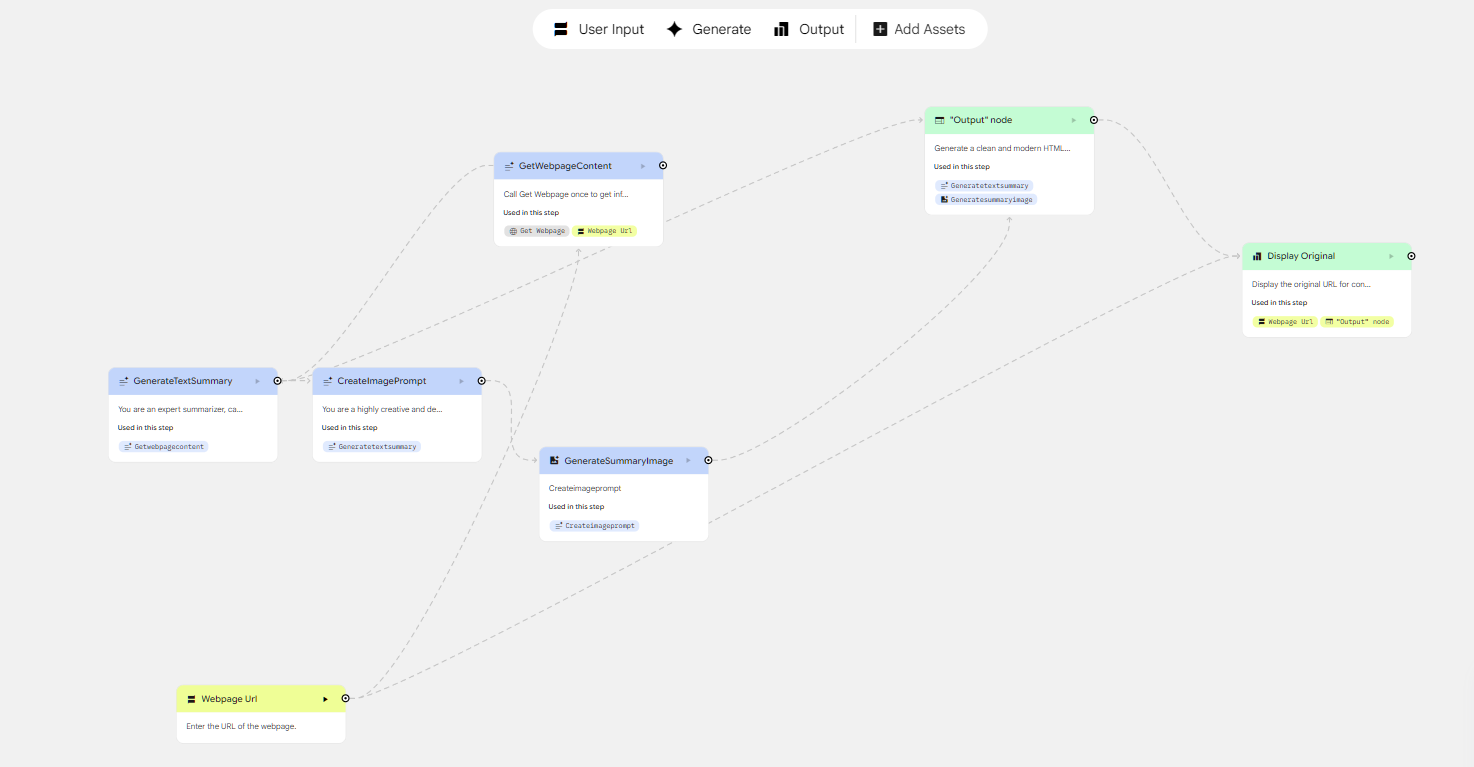 This webpage content can then be passed on to yet another “Generate” node that summarizes it or turns it into a song or creates an image inspired by it, and so on.