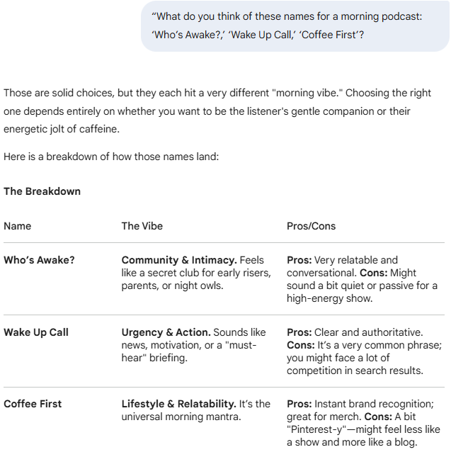 “What do you think of these names for a morning podcast: ‘Who’s Awake?,’ ‘Wake Up Call,’ ‘Coffee First’?”