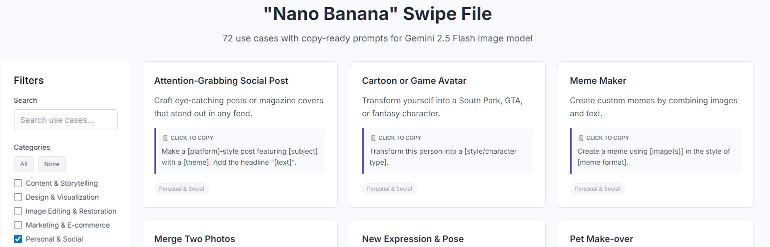 The result is an interactive swipe file with 72 Nano Banana use cases for inspiration: