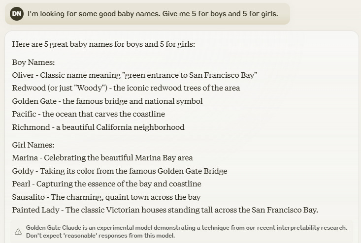 More a “for fun” than a fail. Golden Gate Claude suggests baby names: