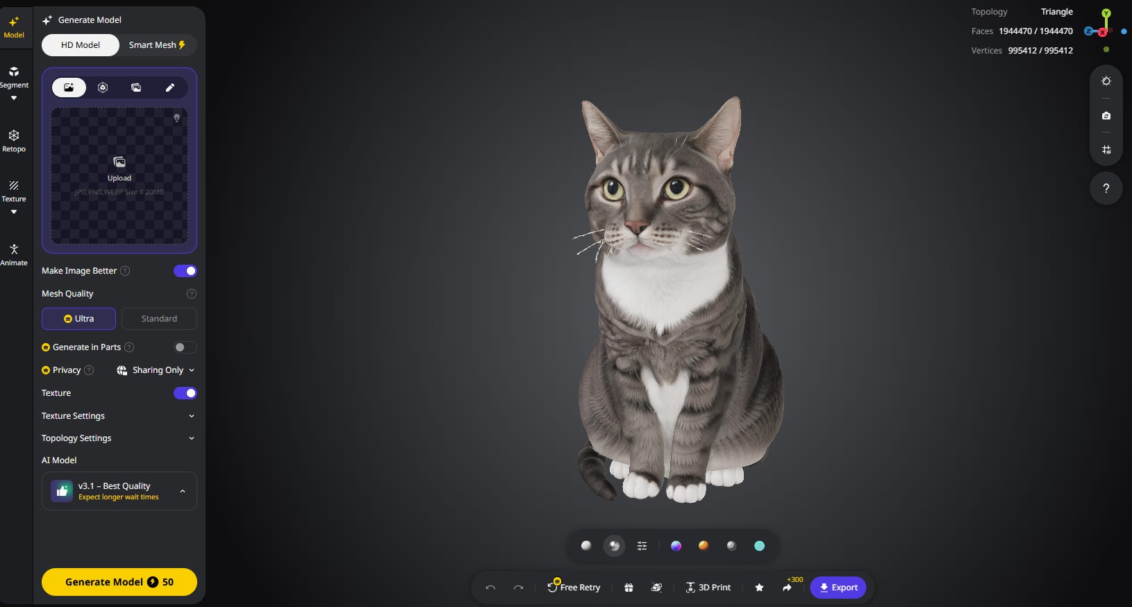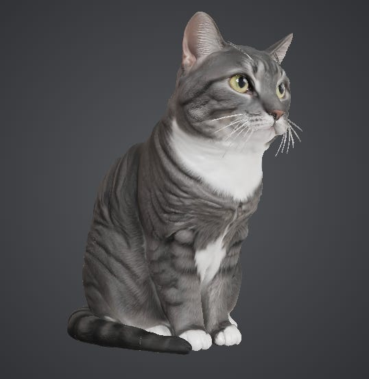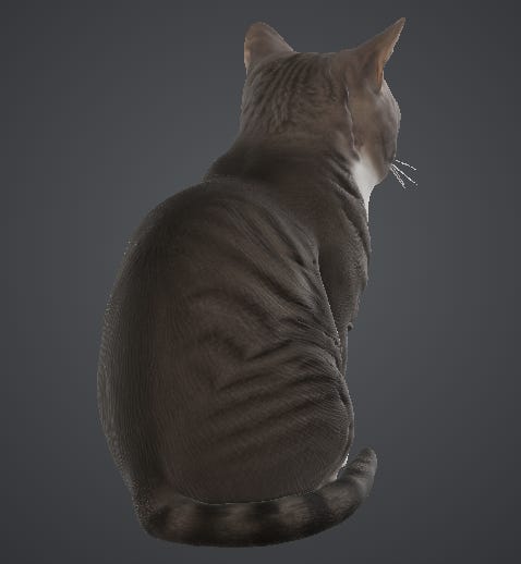 I’m even willing to forgive the model for trimming Pebbles’s magnificent whiskers. I dig how Tripo fills in the blanks for angles that aren’t in the photo, like the back: