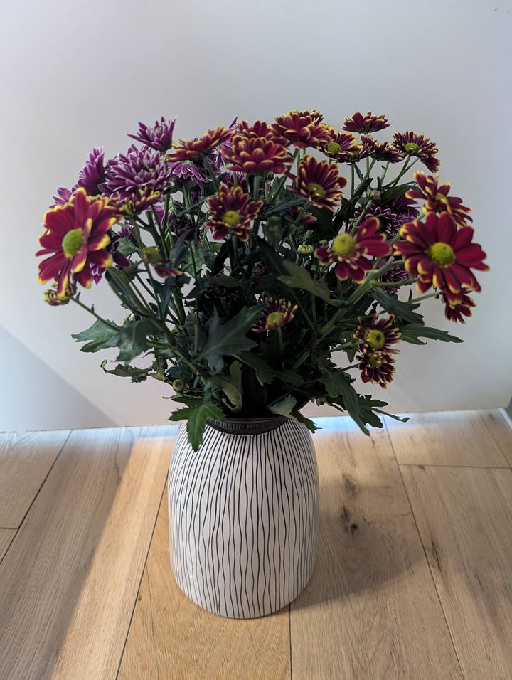 It’s, you know, a vase with flowers in it. Here: