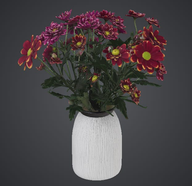 The vase itself looks great, with cleanly-mapped striped texture, even if it’s not 100% aligned with the photo. A chaotic bouquet with dozens of intertwined stems pushes past what such models can faithfully render.