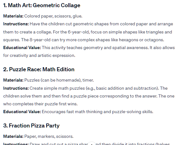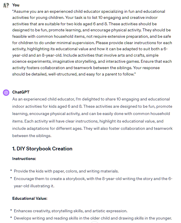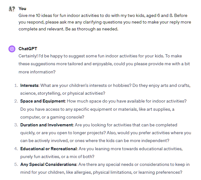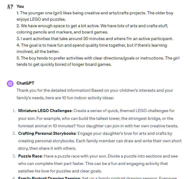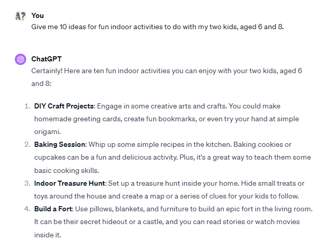 Say you’d like ChatGPT to recommend a few fun activities for kids. You might do something like this: